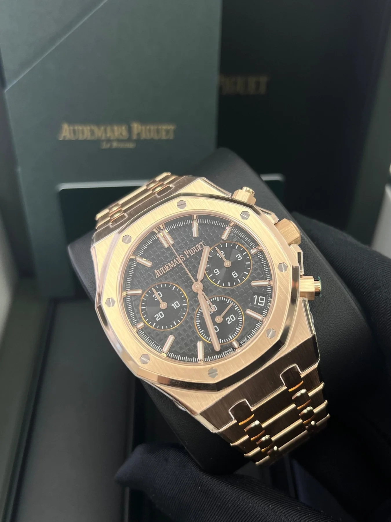 Black dial with “Grande Tapisserie” pattern, black counters, pink gold applied hour-markers and Royal Oak hands with luminescent coating.