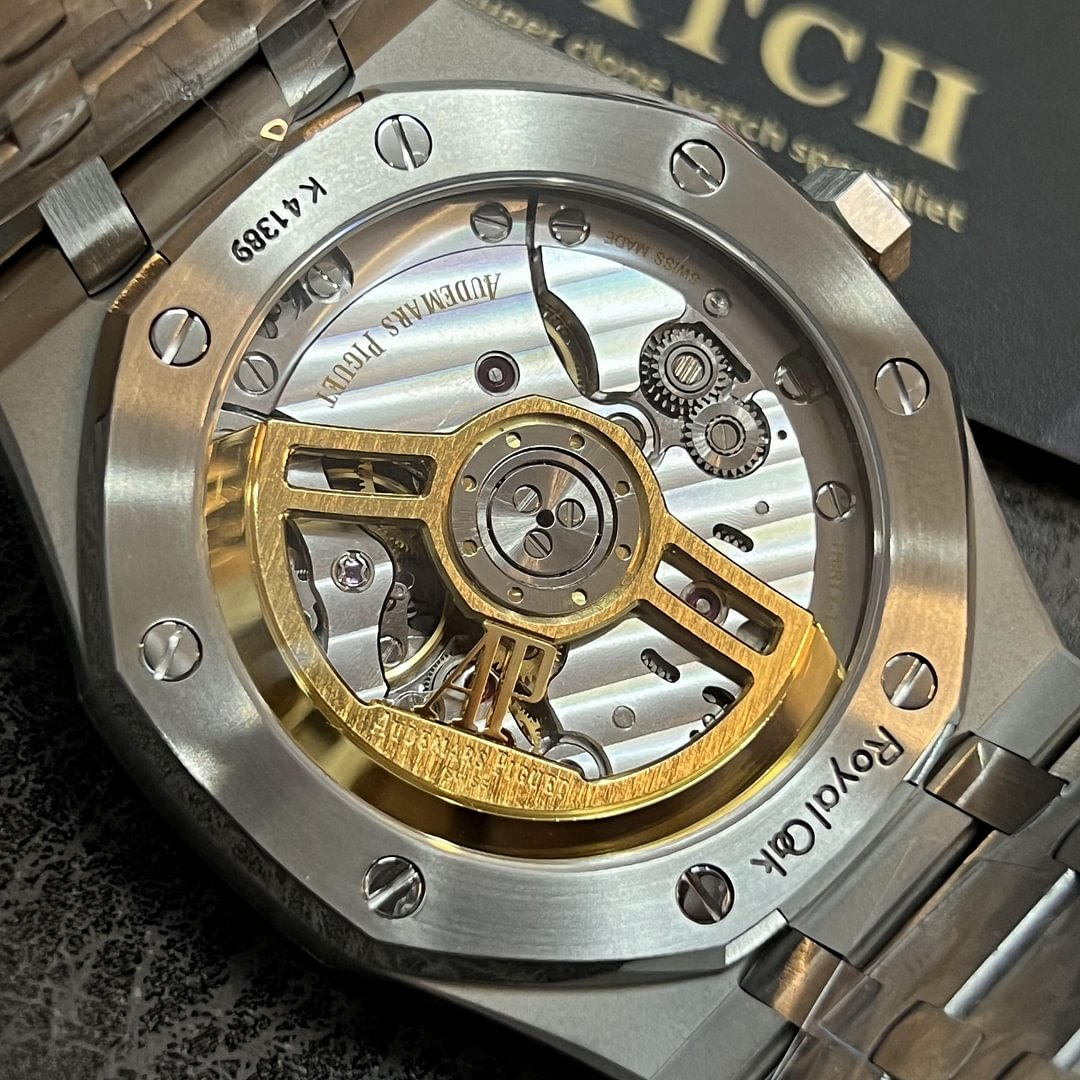 Date display at the 3 o’clock position. Audemars Piguet Calibre 4302 Automatic movement, containing 32 Jewels, bitting at 28800 vph, and has a power reserve of approximately 70 hours. Scratch resistant sapphire crystal.
