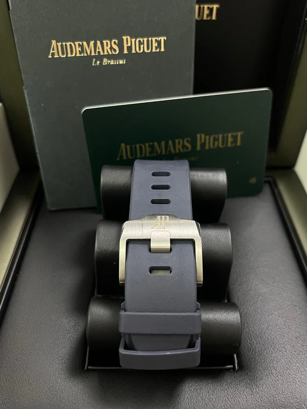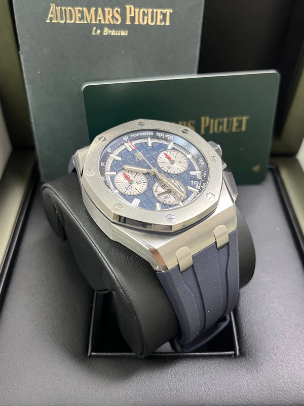 Blue dial with “Méga Tapisserie” pattern, rhodium-toned counters and external zone, white gold applied hour-markers and Royal Oak hands with luminescent coating, blue inner bezel