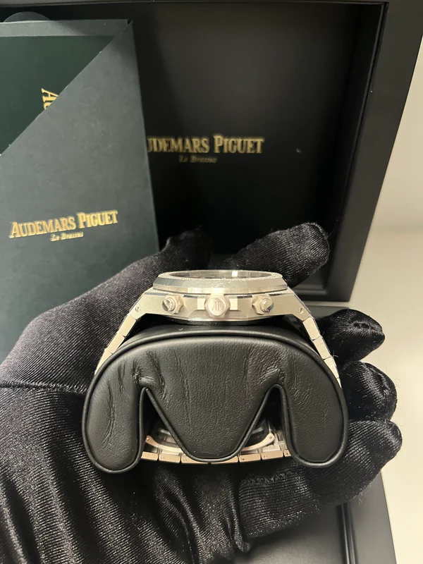 Black dial with “Grande Tapisserie” pattern, rhodium-toned counters, white gold applied hour-markers and Royal Oak hands with luminescent coating.
