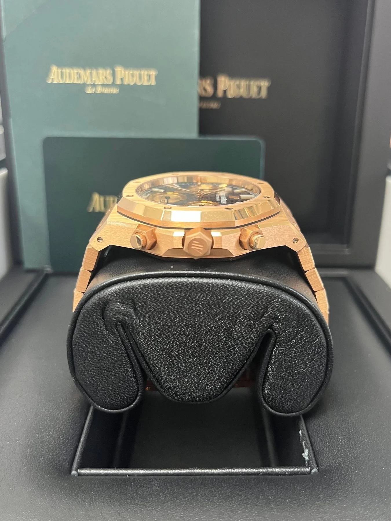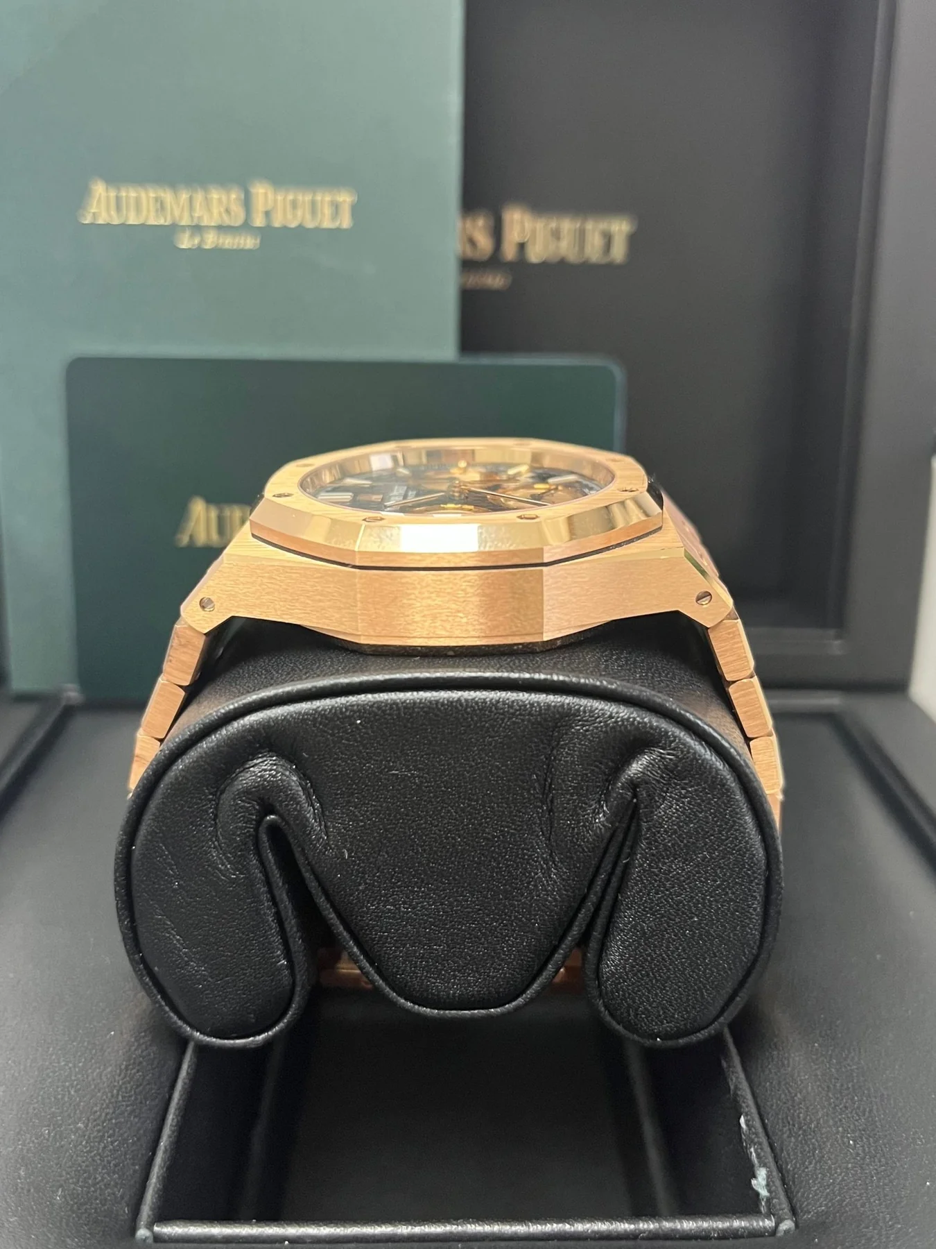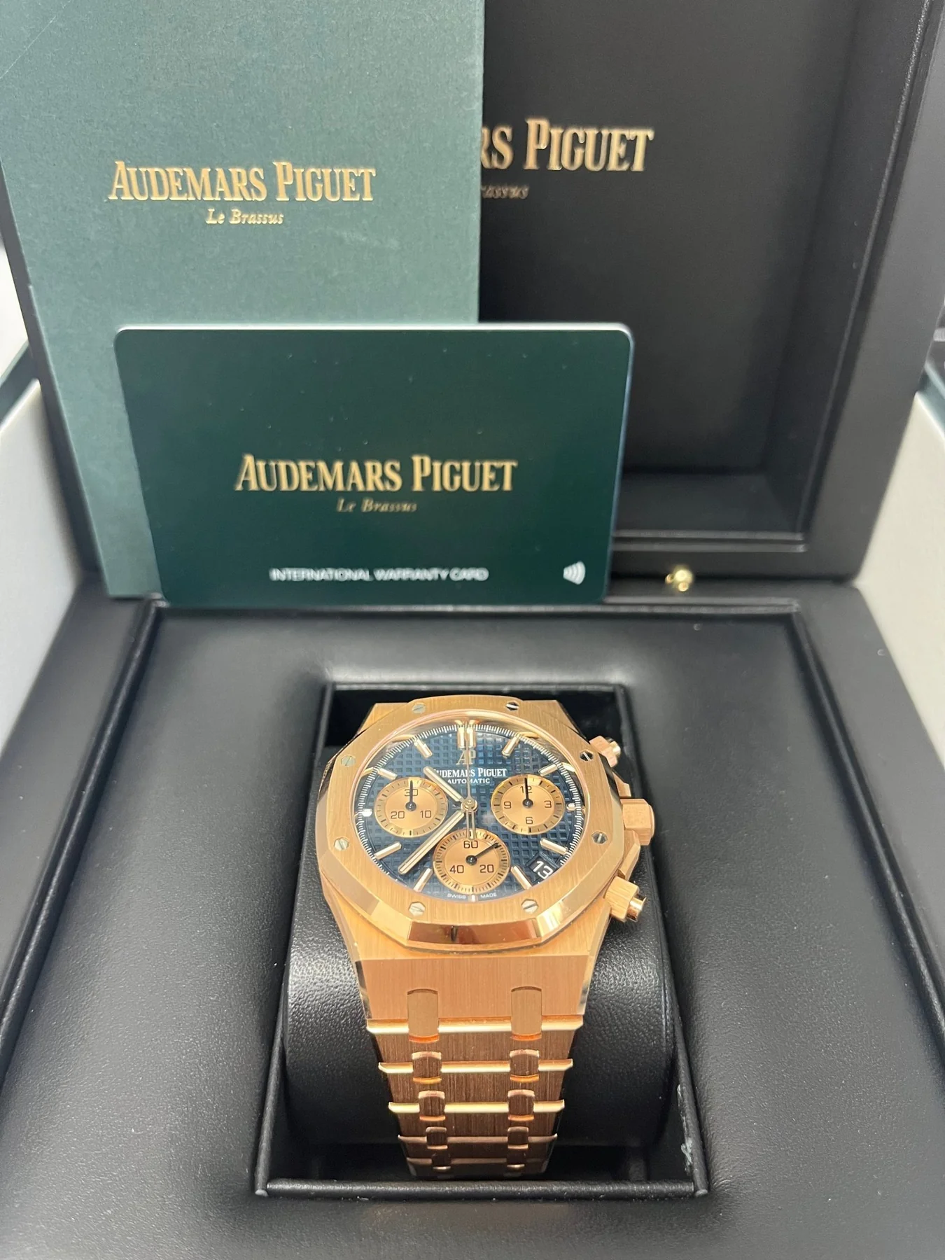 Blue dial with “Grande Tapisserie” pattern, pink gold-toned counters, pink gold applied hour-markers and Royal Oak hands with luminescent coating.