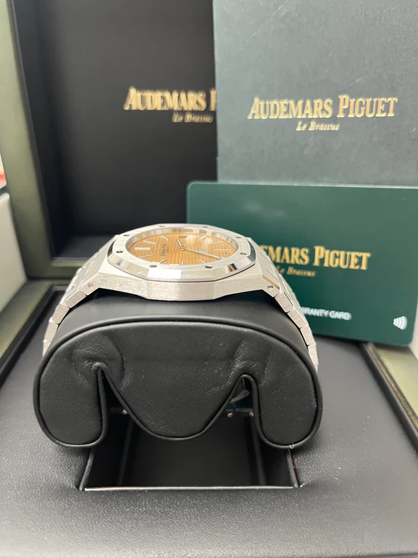 Pink gold-toned dial with “Petite Tapisserie” pattern, white gold applied hour-markers and Royal Oak hands with luminescent coating.