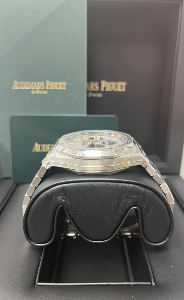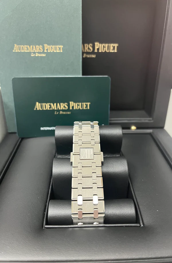 Silver-toned dial with “Grande Tapisserie” pattern, black counters and extern zone, white gold applied hour-markers and Royal Oak hands with luminescent coating.