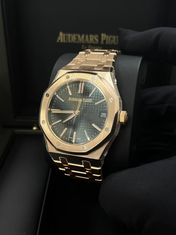 Black dial with “Grande Tapisserie” pattern, pink gold applied hour-markers and Royal Oak hands with luminescent coating.