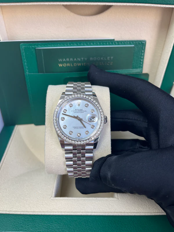 This dial features diamonds in 18 ct gold settings. Mother-of-pearl is by its nature full of mystery and surprises. Depending on its origin, it can be pink, white, black or yellow. It differs in colour, intensity and structure according to the part of the shell from which it is extracted. At Rolex, mother-of-pearl is never artificially coloured. Instead, particular know-how and skill are devoted to simply highlighting its natural beauty and preserving the original hues. As all mother-of-pearl dials are unique pieces, an identical dial will never be found on another wrist.