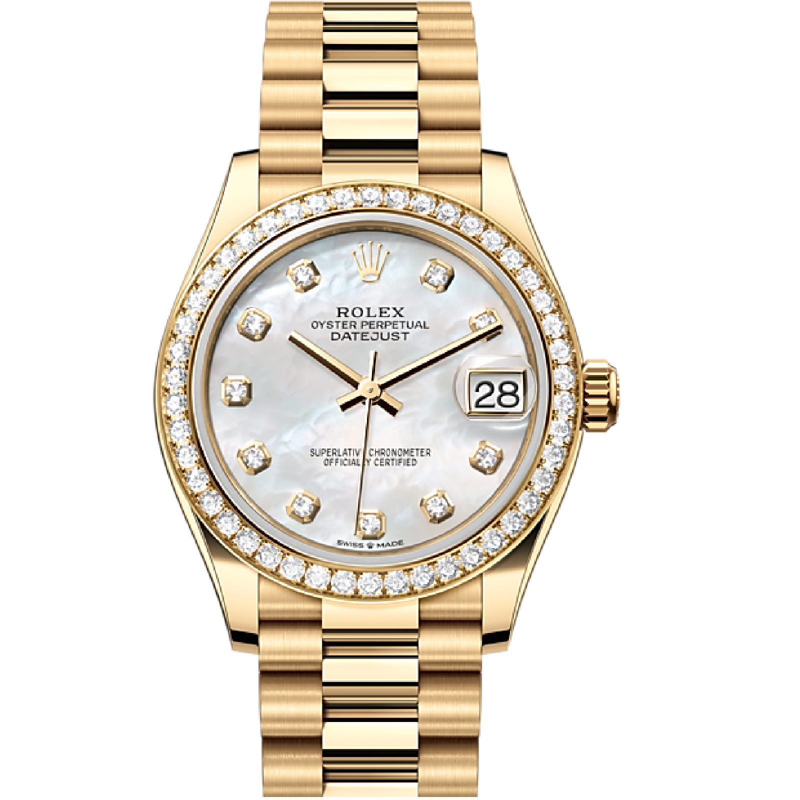 This dial features diamonds in 18 ct gold settings. Mother-of-pearl is by its nature full of mystery and surprises. Depending on its origin, it can be pink, white, black or yellow. It differs in colour, intensity and structure according to the part of the shell from which it is extracted. At Rolex, mother-of-pearl is never artificially coloured. Instead, particular know-how and skill are devoted to simply highlighting its natural beauty and preserving the original hues. As all mother-of-pearl dials are unique pieces, an identical dial will never be found on another wrist.