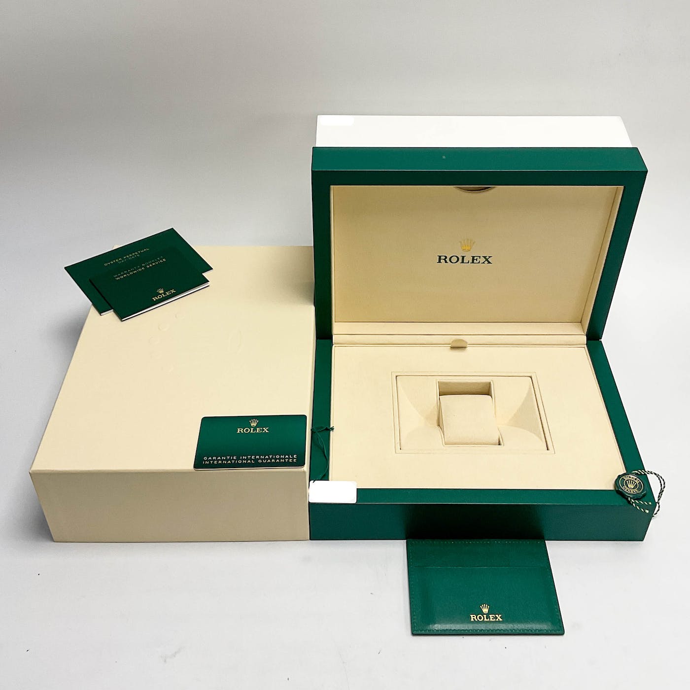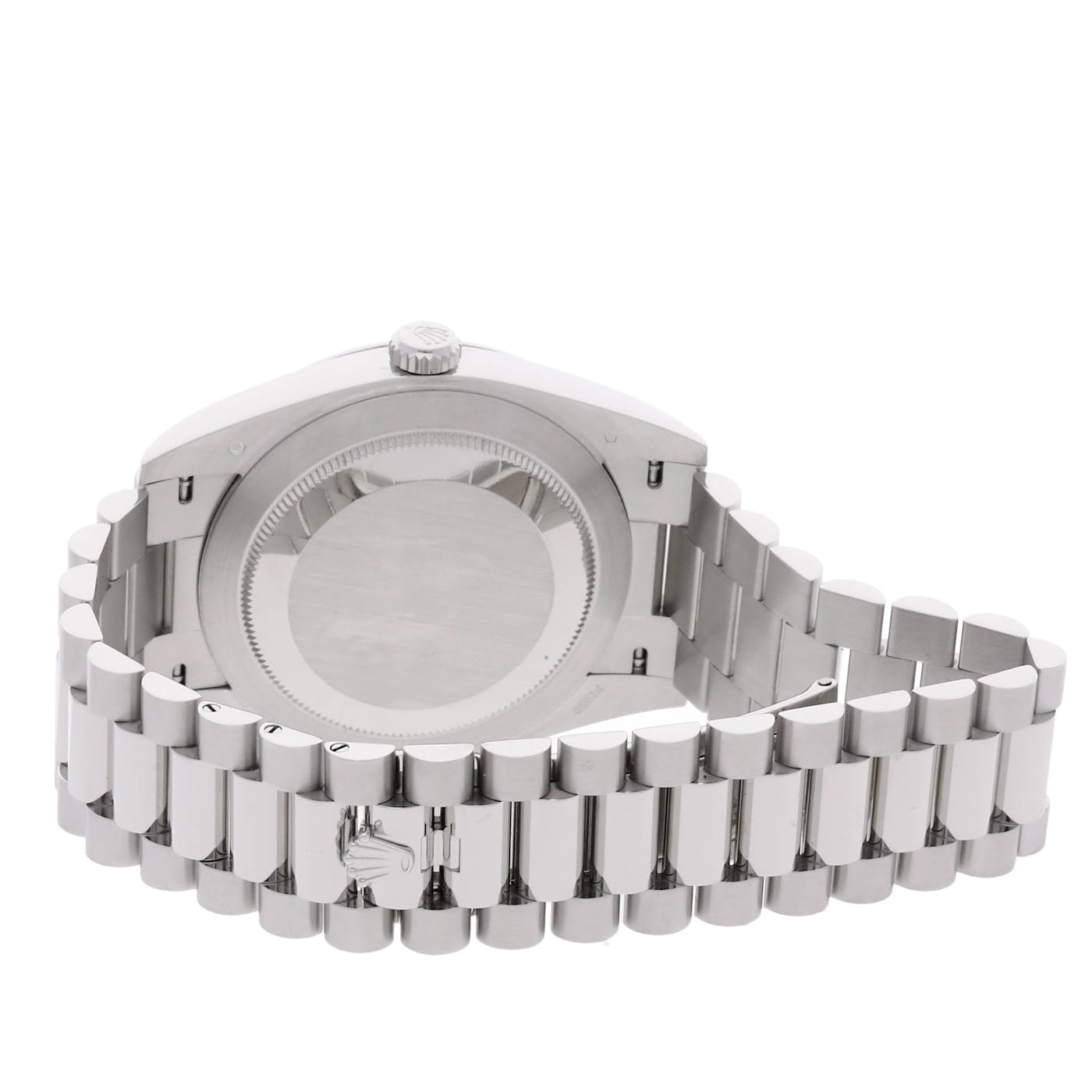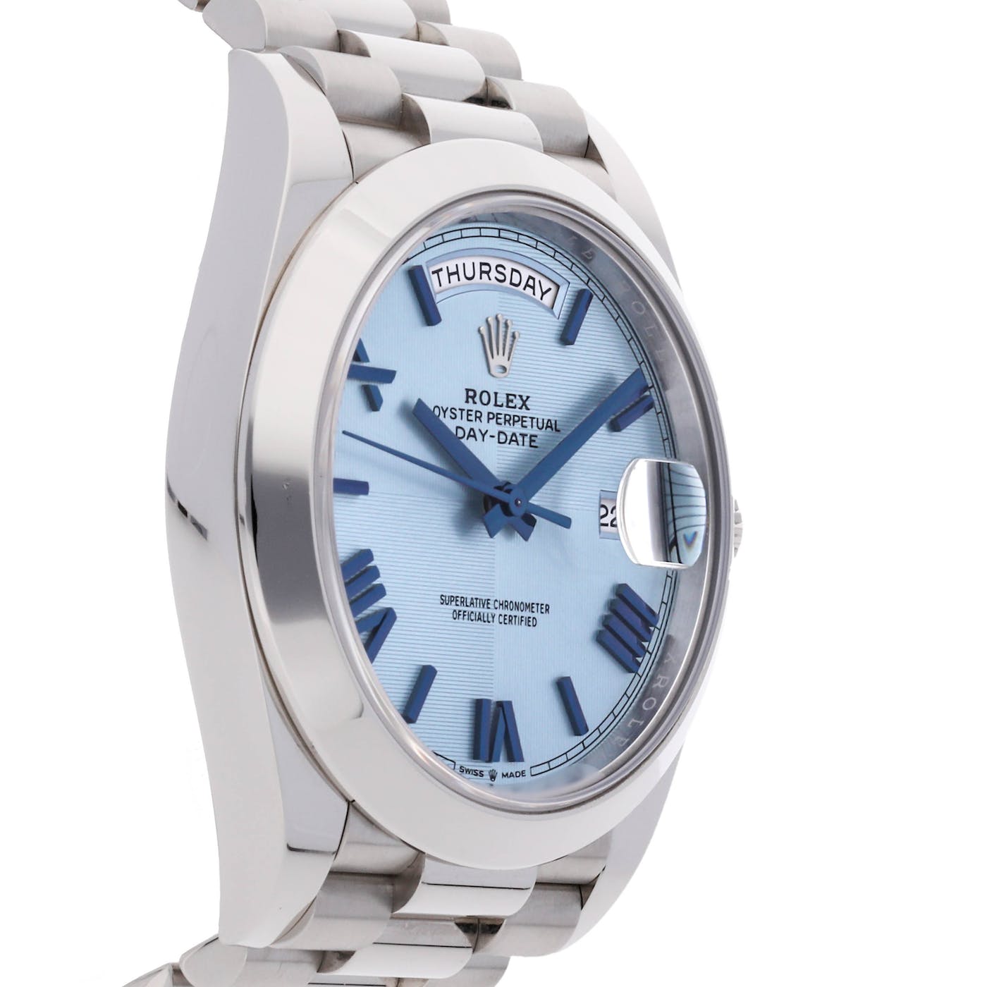 40mm 950 platinum case, screw-down back with Rolex fluting, screw-down crown with twinlock double waterproofness system, smooth bezel, scratch-resistant double anti-reflective sapphire crystal with cyclops lens over the date, ice blue quadrant motif dial, bevelled deconstructed Roman numerals, Rolex calibre 3255 automatic movement with centre hour, minute and seconds hands, instantaneous day and date in apertures, unrestricted rapid-setting, and stop-seconds for precise time setting, approximately 70 hours of power reserve, President bracelet with three-piece solid links comprised of a polished center link, satin-finished outer links, and ceramic inserts,