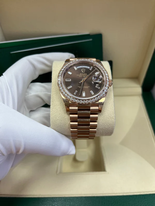 40mm 18K Everose gold case, screw-down back with Rolex fluting, screw-down crown with twinlock double waterproofness system, Everose gold bezel set with 48 diamonds, scratch-resistant double anti-reflective sapphire crystal with cyclops lens over the date, chocolate dial, 10 baguette diamond hour markers, Rolex calibre 3255 automatic movement with centre hour, minute and seconds hands, instantaneous day and date in apertures, unrestricted rapid-setting, and stop-seconds for precise time setting, approximately 70 hours of power reserve, President bracelet with three-piece solid links comprised of a polished center link, satin-finished outer links, and ceramic inserts, concealed folding Crownclasp buckle. Waterproof to 100 meters.