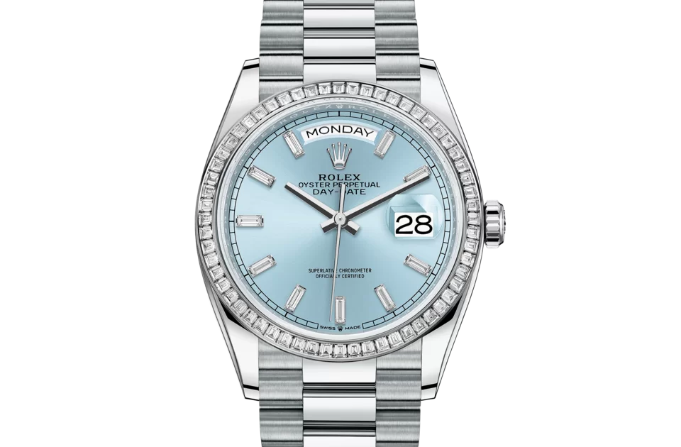 The ice-blue dial is the discreet and exclusive signature of a Rolex platinum watch. Rolex uses platinum, the noblest of metals, for the finest of watches. These exclusive dials can be found only on the Day-Date and the Cosmograph Daytona.