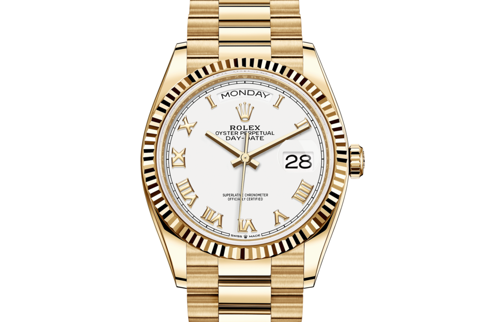 The Rolex fluted bezel is a mark of distinction. Originally, the fluting of the Oyster bezel had a functional purpose: it served to screw the bezel onto the case helping to ensure the waterproofness of the watch. It was therefore identical to the fluting on the case back, which was also screwed onto the case for waterproofness, using specific Rolex tools. Over time, the fluting became an aesthetic element, a genuine Rolex signature feature. Today the fluted bezel is a mark of distinction, in gold on this Day-Date 36.