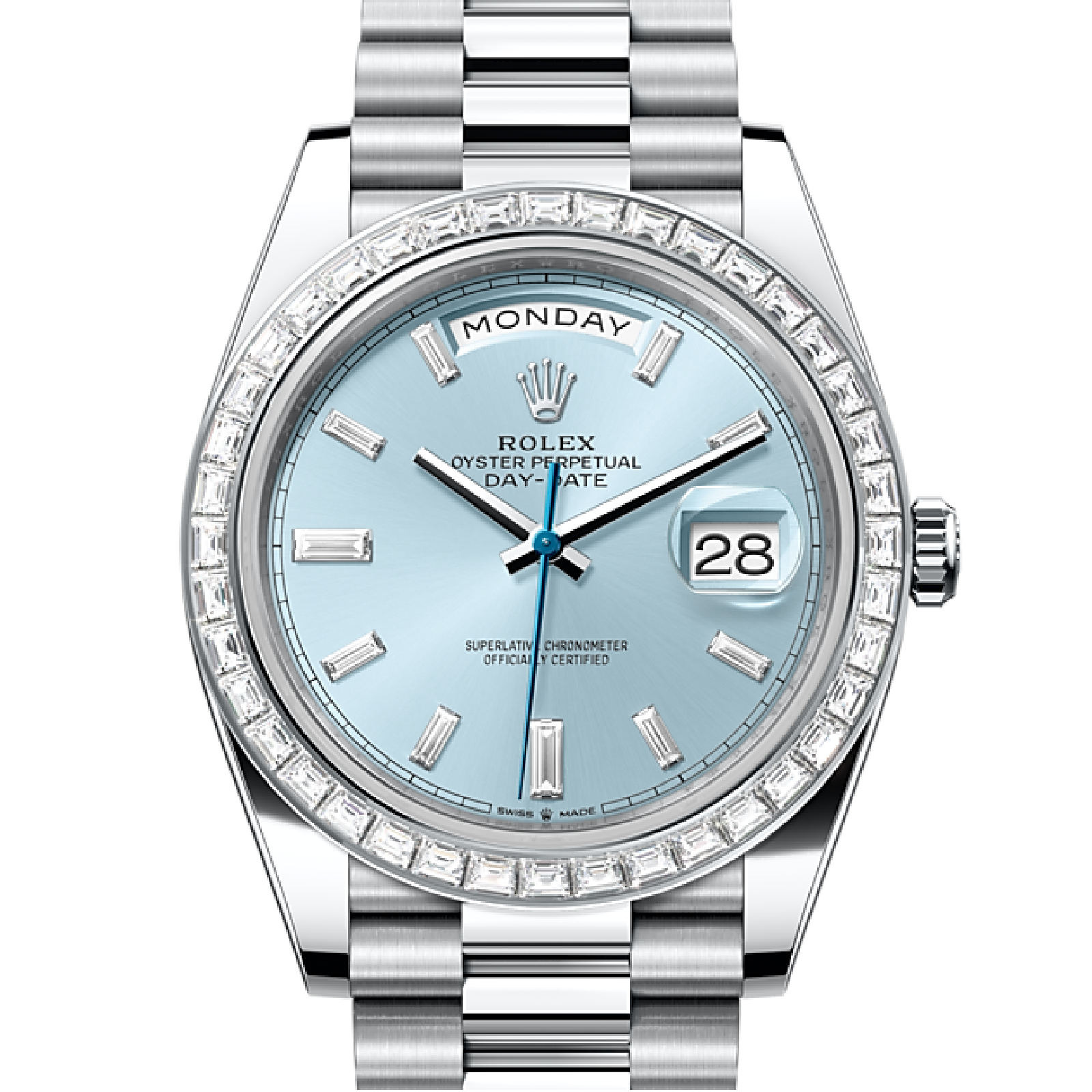 The ice-blue dial is the discreet and exclusive signature of a Rolex platinum watch. Rolex uses platinum, the noblest of metals, for the finest of watches. These exclusive dials can be found only on the Day-Date and the Cosmograph Daytona.