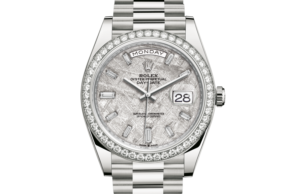 This dial features 10 baguette-cut diamonds. Formed in the far reaches of the solar system, metallic meteorite comes from an asteroid that exploded millions of years ago. On the voyage between planets, fragments of this natural extraterrestrial material, primarily composed of iron and nickel, cool by a few degrees Celsius every million years, creating unique, distinctive crystallization within the material that is impossible to recreate on Earth. Metallic meteorite is rare and challenging to work with, but once it is cut into thin sections and a chemical treatment is applied, the great beauty of its interwoven internal structure is revealed. These fascinating and varied formations are known as Widmanstätten patterns. For its dials, Rolex works with leading experts in the field and selects only the sections of meteorite with a particularly well-formed surface rich in different shapes and reflections.