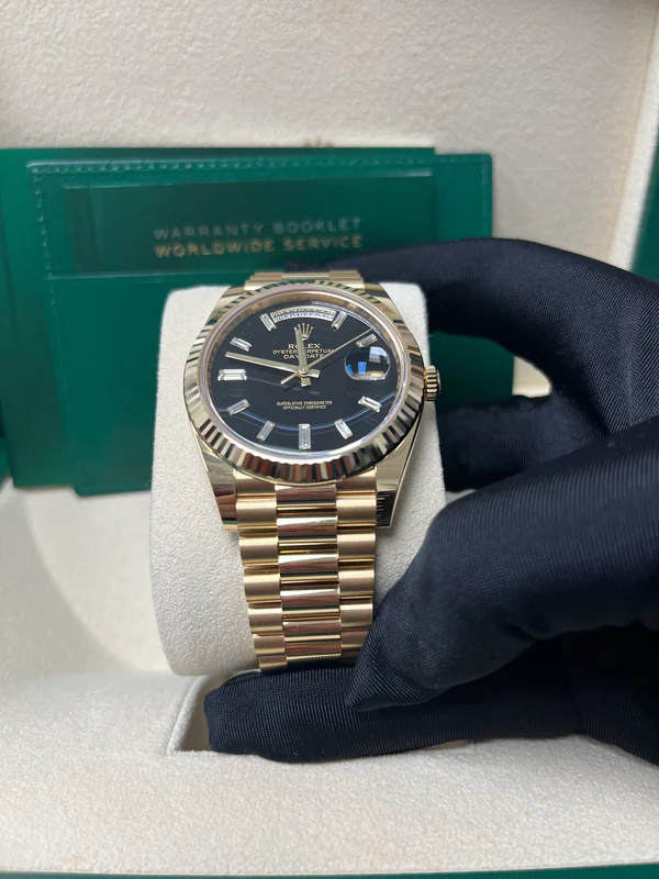 The Rolex fluted bezel is a mark of distinction. Originally, the fluting of the Oyster bezel had a functional purpose: it served to screw the bezel onto the case helping to ensure the waterproofness of the watch. It was therefore identical to the fluting on the case back, which was also screwed onto the case for waterproofness, using specific Rolex tools. Over time, the fluting became an aesthetic element, a genuine Rolex signature feature. Today the fluted bezel is a mark of distinction, in gold on this Day-Date 40.