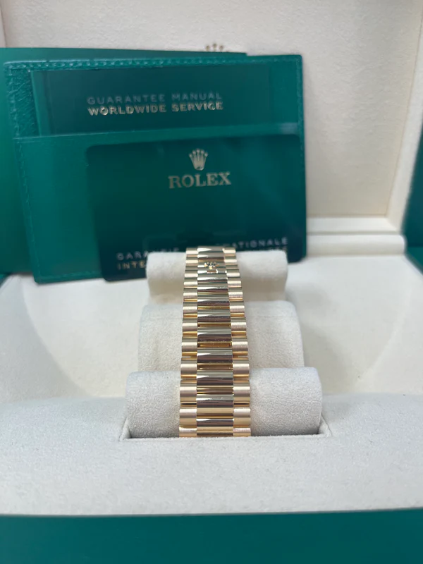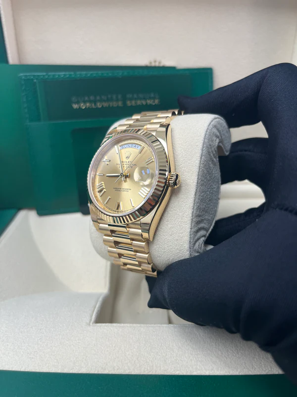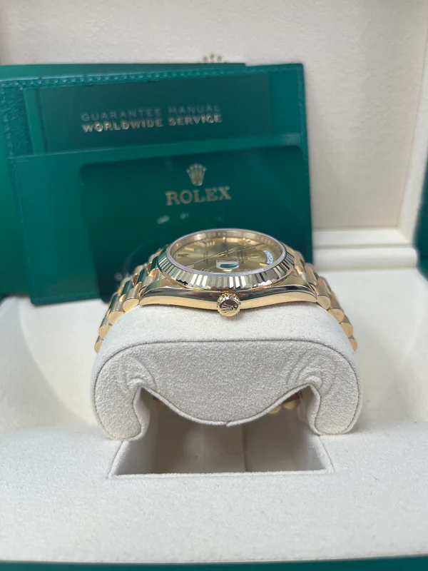 The Rolex fluted bezel is a mark of distinction. Originally, the fluting of the Oyster bezel had a functional purpose: it served to screw the bezel onto the case helping to ensure the waterproofness of the watch. It was therefore identical to the fluting on the case back, which was also screwed onto the case for waterproofness, using specific Rolex tools. Over time, the fluting became an aesthetic element, a genuine Rolex signature feature. Today the fluted bezel is a mark of distinction, in gold on this Day-Date 40.
