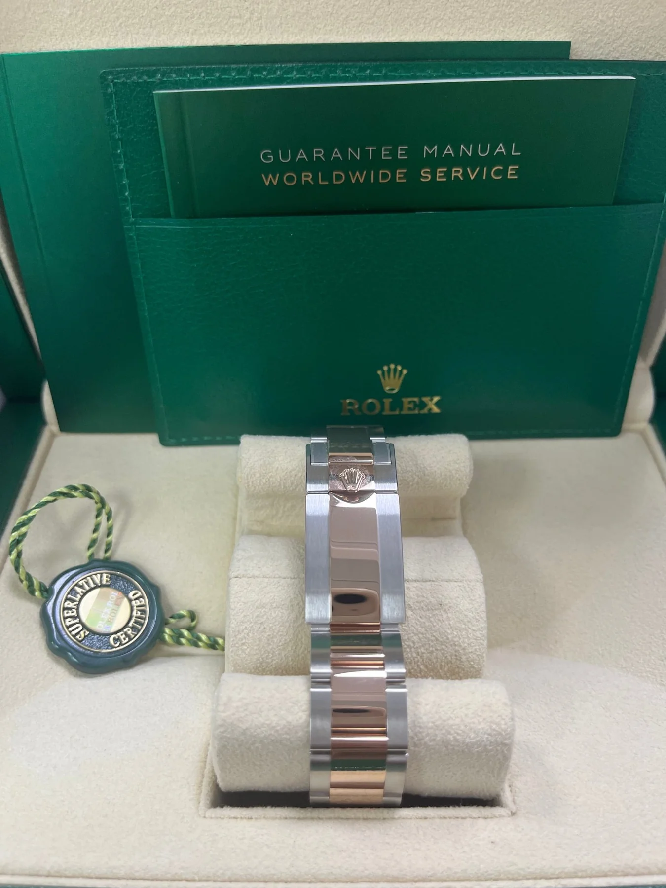 Case: Two tone rose gold plated and stainless steel case with screw-down crown and ceramic bezel. Case diameter: 40mm. Height: 12mm. (904L Stainless Steel).
