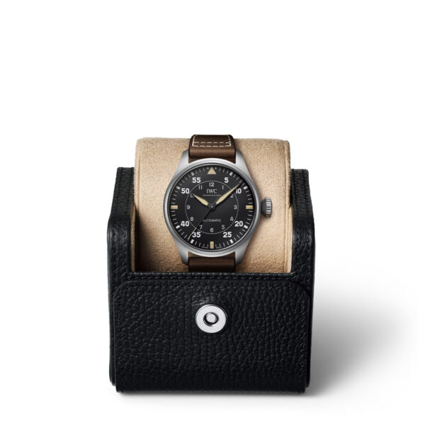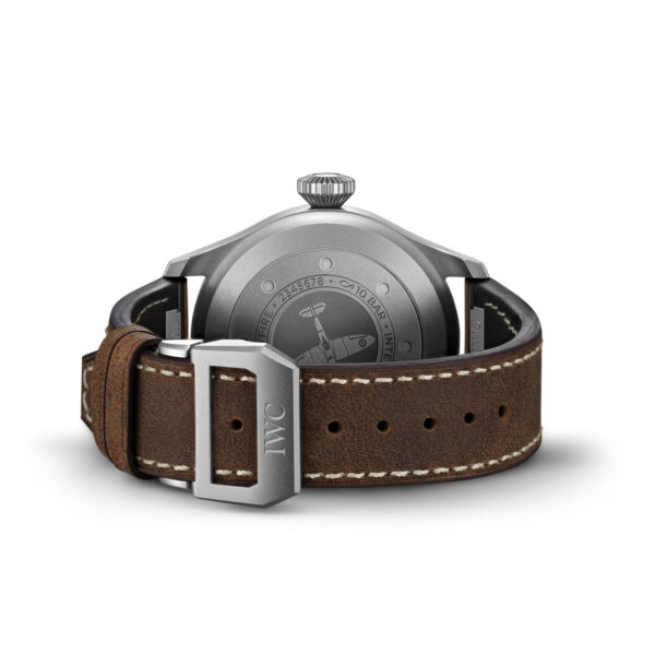 This IWC Pilot’s Watch 43mm Spitfire reflects the brand’s military history, featuring a black dial with luminescence on an easily wearable 43mm titanium case that has been polished and sandblasted to give it a dark grey matte colour, recalling classic cockpit instruments. This watch also features an engraved case back with the lengedary RAF plane, fitted on a brown buffalo strap to complete the overall military aesthetic and providing a unique feeling on the wrist. Powered by the IWC-manufactured 82100 Calibre, offering 60 hours power reserve.