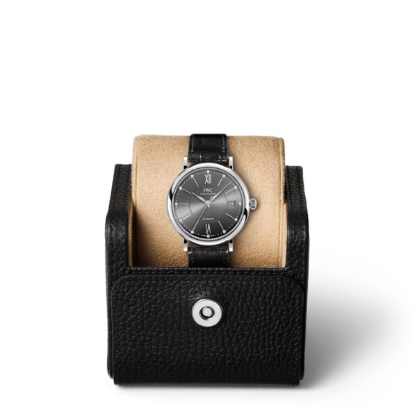 This IWC Portofino Automatic 37mm combines purist design with a touch of luxury. Featuring a slate coloured-dial with a sun-pattern finish and rhodium-plated hands, set with 12 dazzling diamonds to give the watch a radiance of its own, while the design itself remains sleek and simple. It is housed in a slightly smaller 37mm steel case and fitted with a black alligator strap from Santonito to give this feminine watch a special appeal and extra comfort to wear. This watch is powered by the 35111 Calibre, offering up to 42 hours of power reserve.