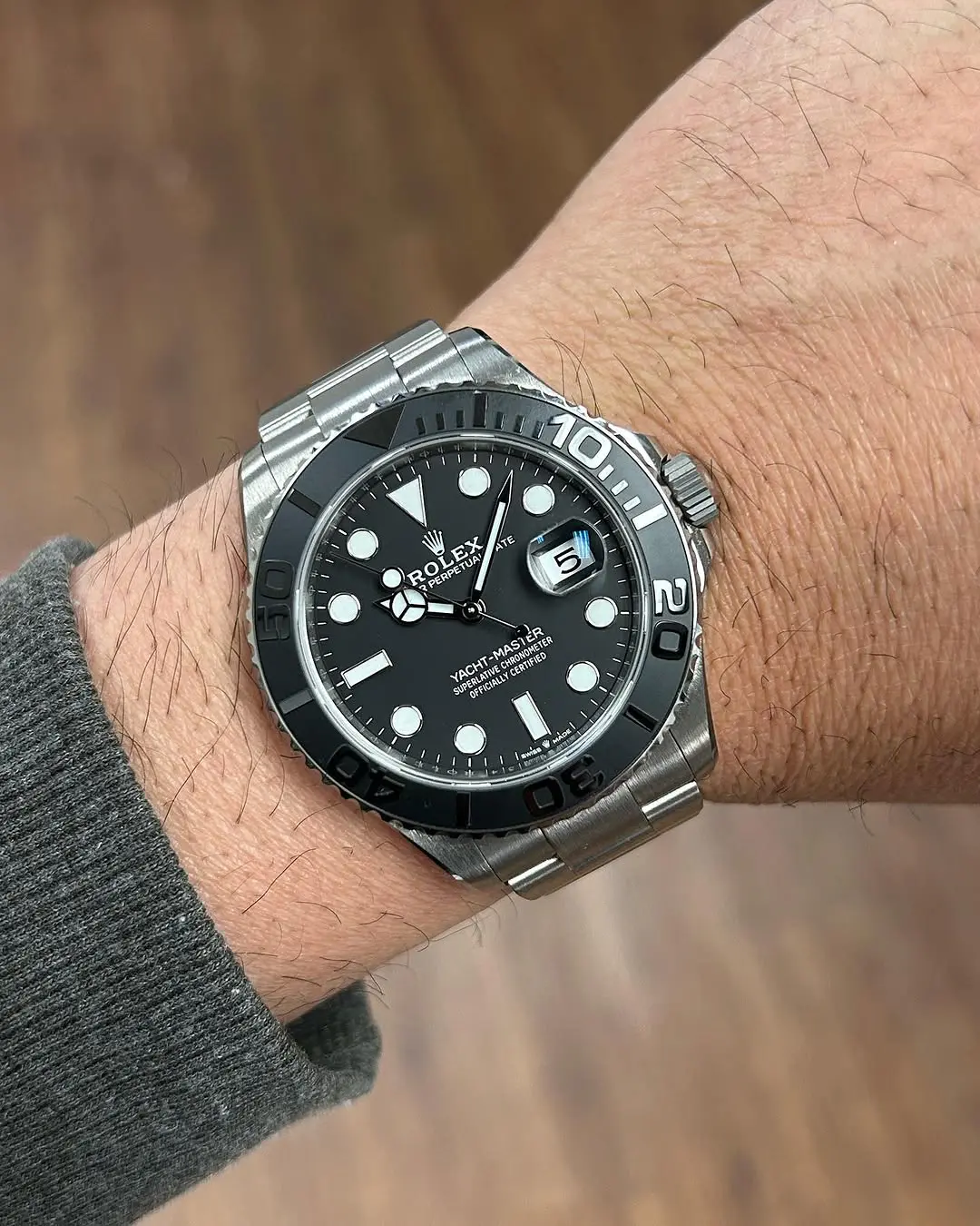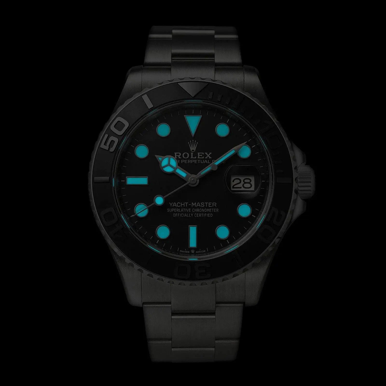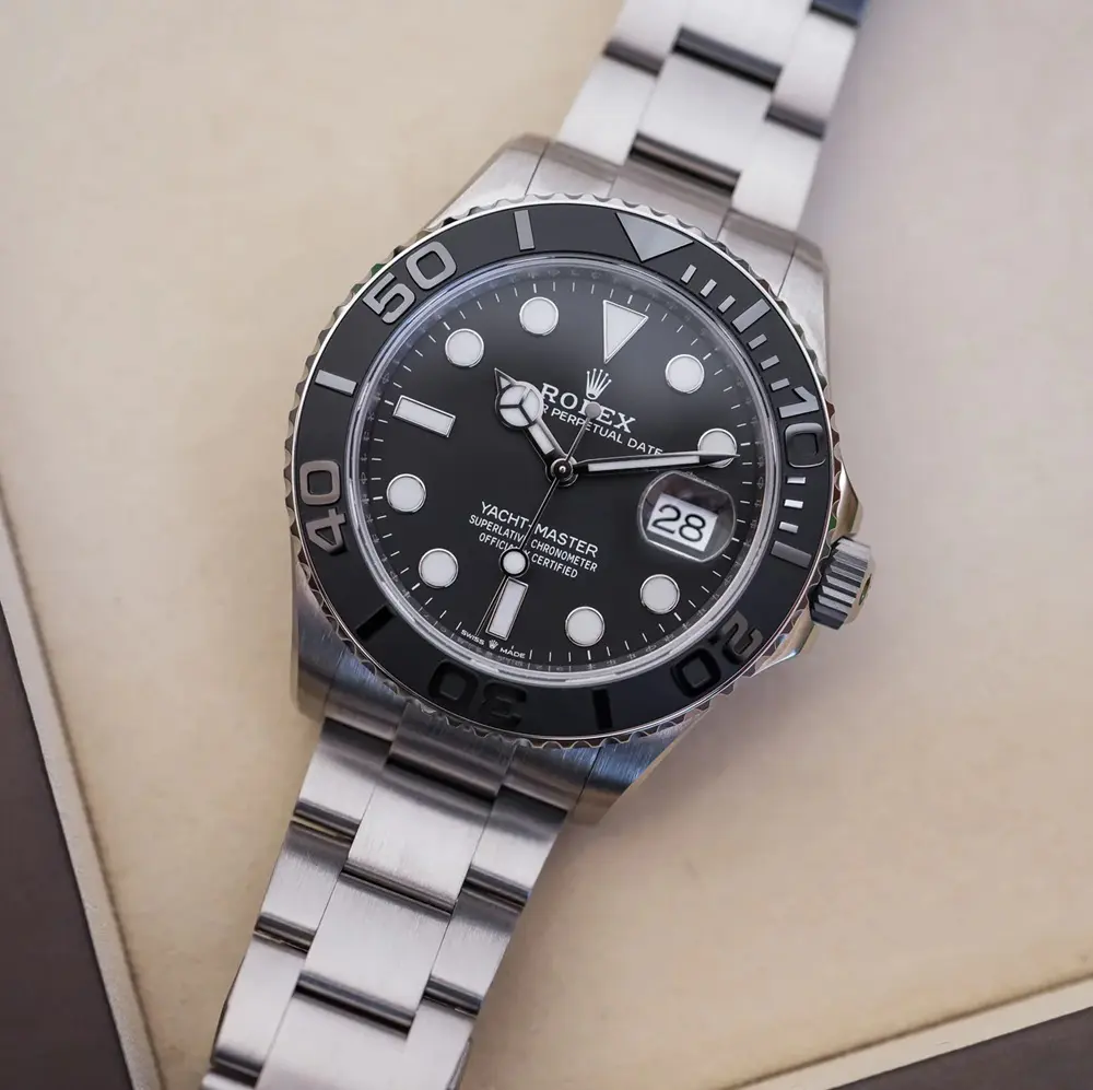 The 42mm monobloc middle case of the Yacht-Master 42 is intricately designed with a screw-down case back and winding crown, ensuring its water resistance of up to 100 meters. The bidirectional rotatable 60-minute graduated bezel with a matte black Cerachrom insert in ceramic is another highlight of this timepiece. The polished raised numerals and graduations on the bezel add a touch of sophistication and functionality to the watch, allowing for easy tracking of elapsed time during diving or other outdoor activities.