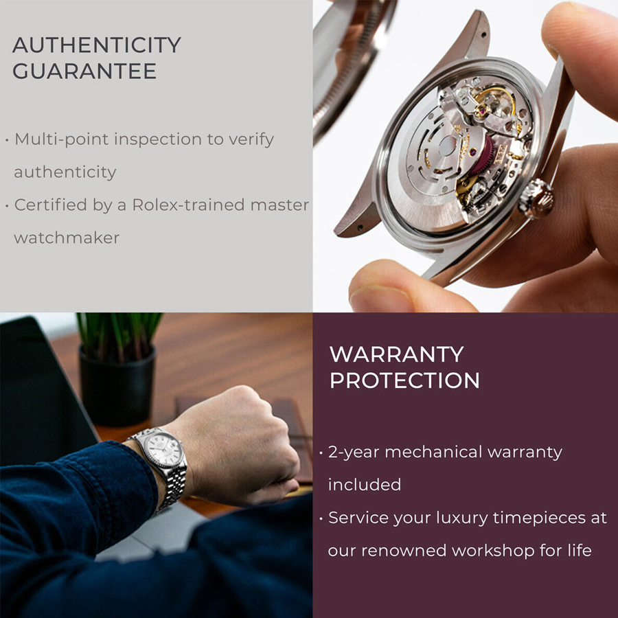Your satisfaction is our priority. Please reach out to us and our customer support team will assist with any and all questions regarding your current or future purchases. All watches sold by our company are tested and guaranteed to be 100% authentic by our team of trained and certified watchmakers. All watch movements are further covered by a 3 year warranty provided by our store to guarantee functionality and timekeeping.