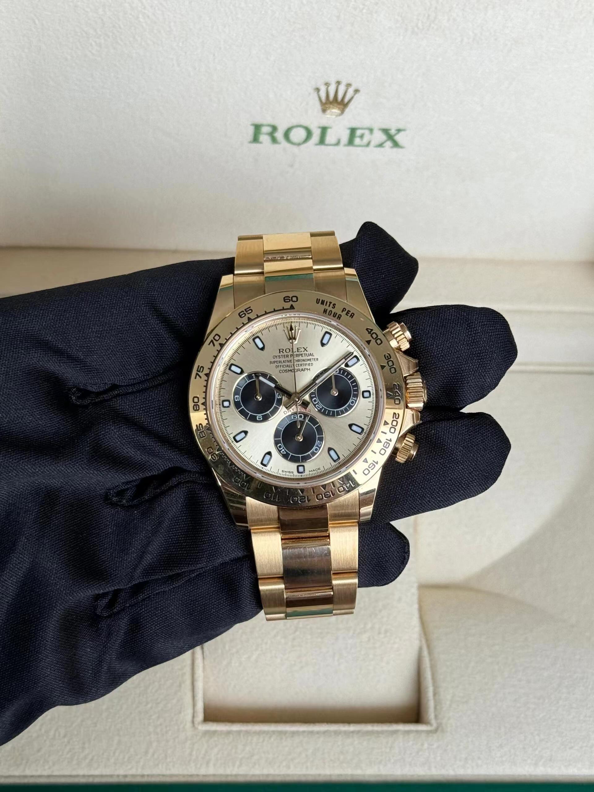 This Oyster Perpetual Cosmograph Daytona in 18 ct yellow gold, with a white dial and an Oyster bracelet, features an 18 ct yellow gold bezel with engraved tachymetric scale.