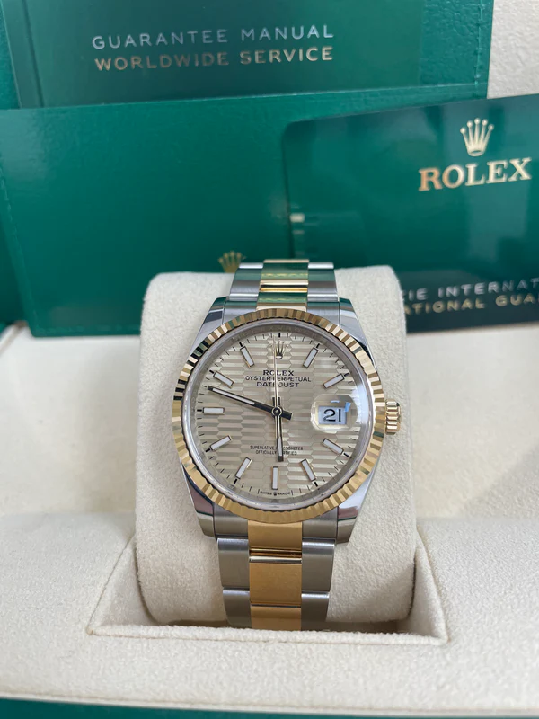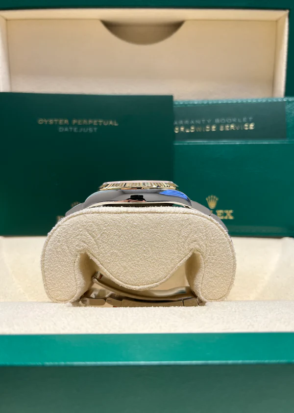 The Rolex fluted bezel is a mark of distinction. Originally, the fluting of the Oyster bezel had a functional purpose: it served to screw the bezel onto the case helping to ensure the waterproofness of the watch. It was therefore identical to the fluting on the case back, which was also screwed onto the case for waterproofness, using specific Rolex tools. Over time, the fluting became an aesthetic element, a genuine Rolex signature feature. Today the fluted bezel is a mark of distinction, in gold on this Datejust 36.