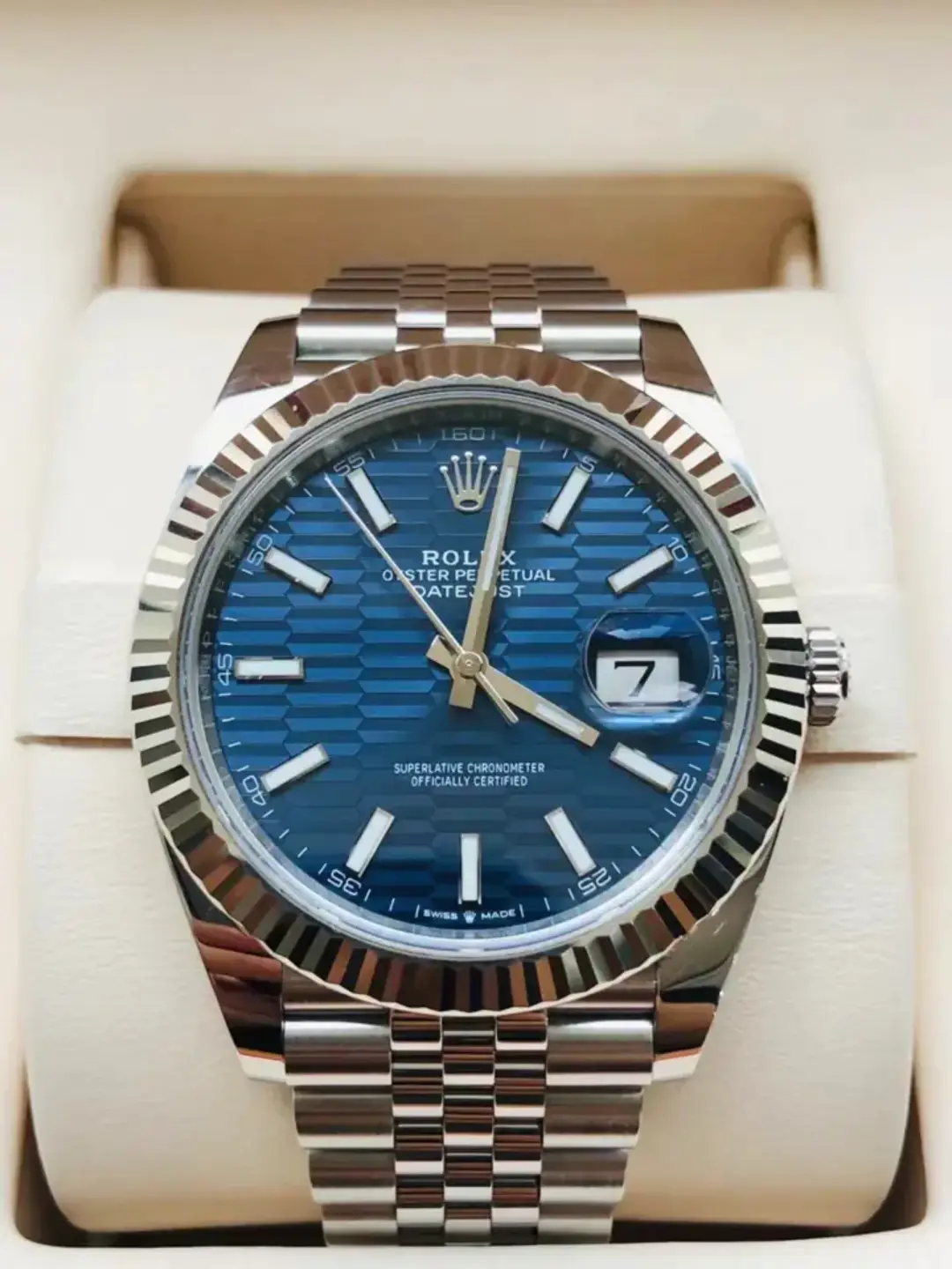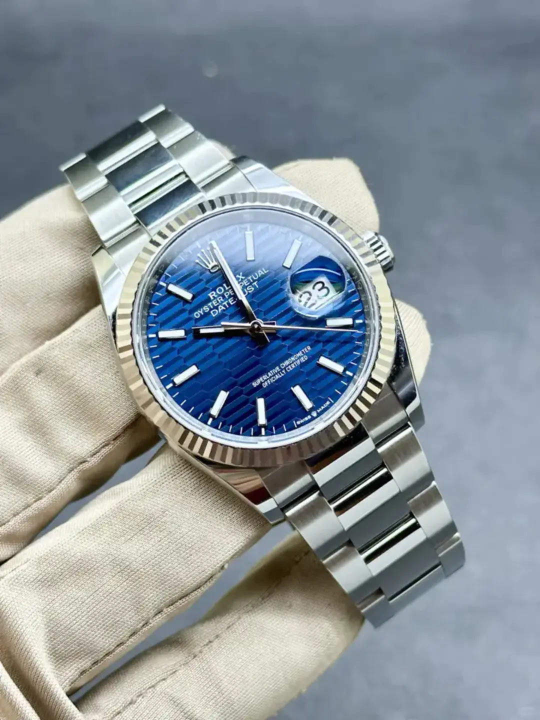 The fluted motif is a graphic interpretation of an iconic Rolex design element: the bezel fluting found exclusively on some of the brand's Classic watches. Made from age-old materials, combined with cutting-edge technology, the fluted-motif dial brings depth and sophistication to the timeless Datejust.
