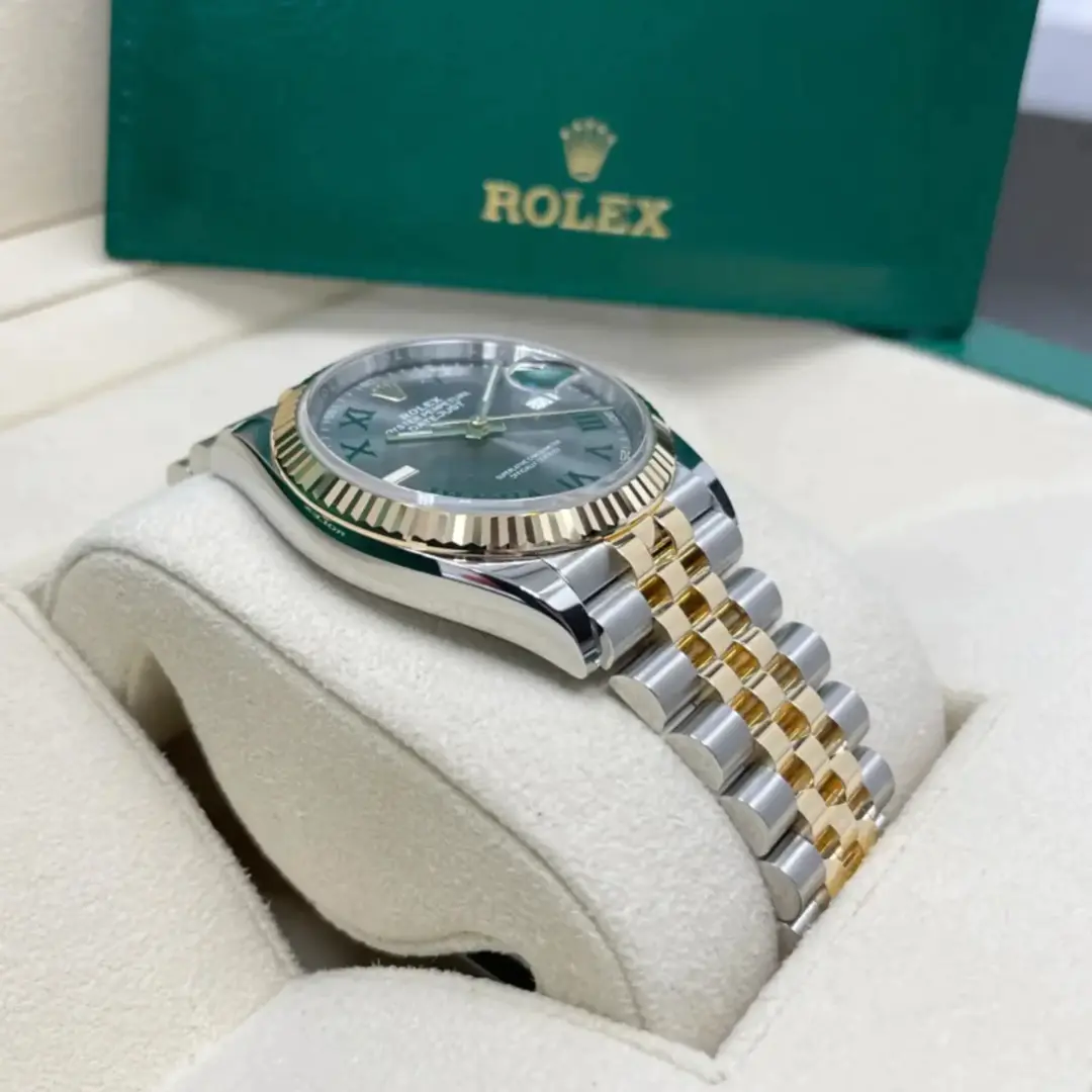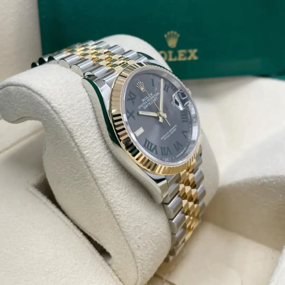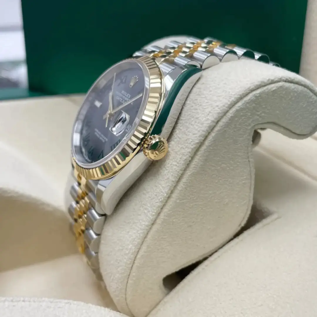 The Rolex fluted bezel is a mark of distinction. Originally, the fluting of the Oyster bezel had a functional purpose: it served to screw the bezel onto the case helping to ensure the waterproofness of the watch. It was therefore identical to the fluting on the case back, which was also screwed onto the case for waterproofness, using specific Rolex tools. Over time, the fluting became an aesthetic element, a genuine Rolex signature feature. Today the fluted bezel is a mark of distinction, in gold on this Datejust 36.