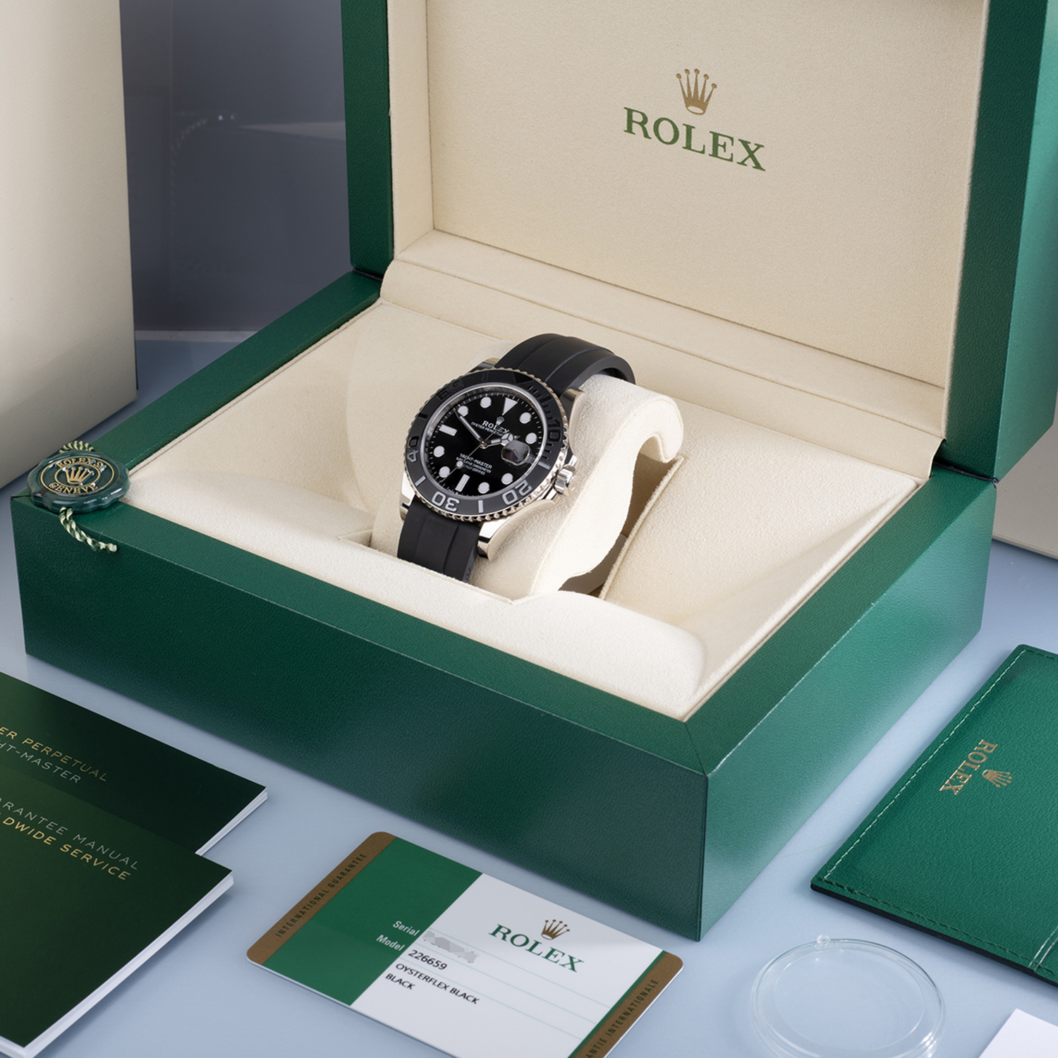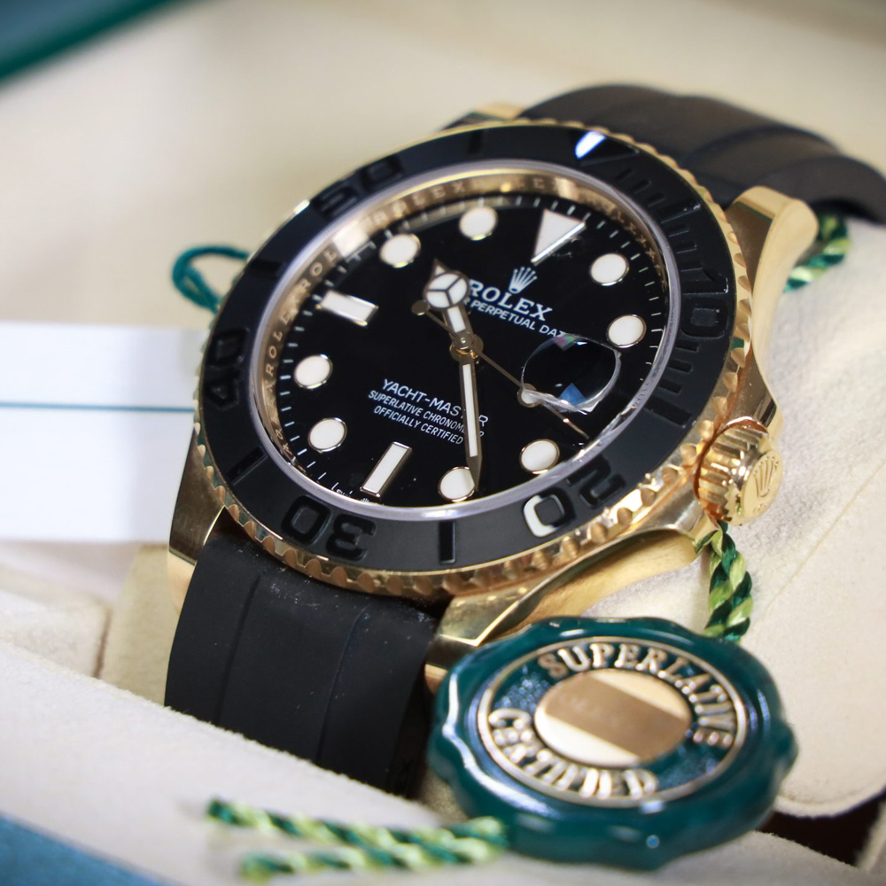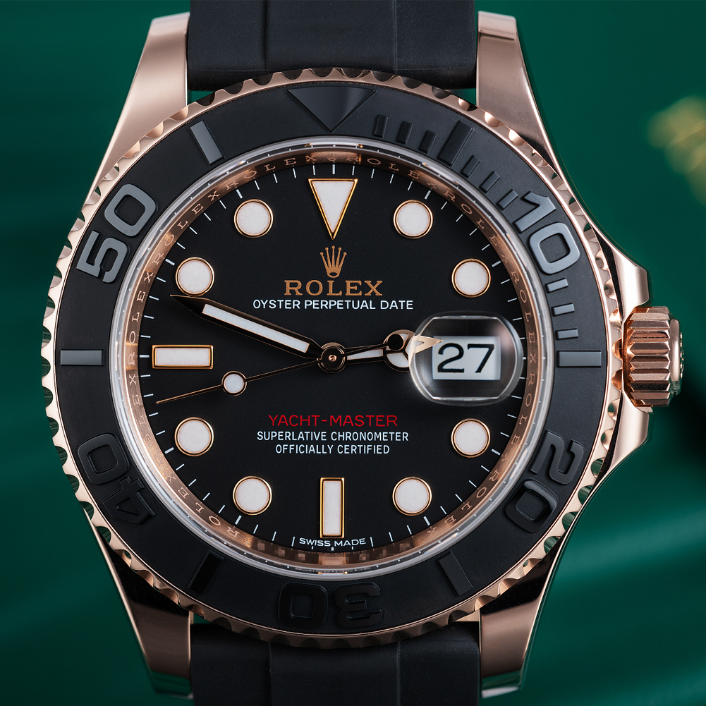 The most desirable Yacht-Master Rolex ever made.  A fully fledged sports watch (waterproof to 100m), yet elegant and discreet enough for the boardroom, this precious metal Yacht-Master ref. 226659 is fitted to the super comfy black Oysterflex strap. Sporting a matt finished bi-directional Cerachrom bezel (developed by Rolex to be scratch & fade resistant ) and a highly legible black dial with Chromalight hands & markers. Powered by Rolex's updated self-winding calibre 3235, now with a generous 70-hour power–reserve. Waterproof to 100m.