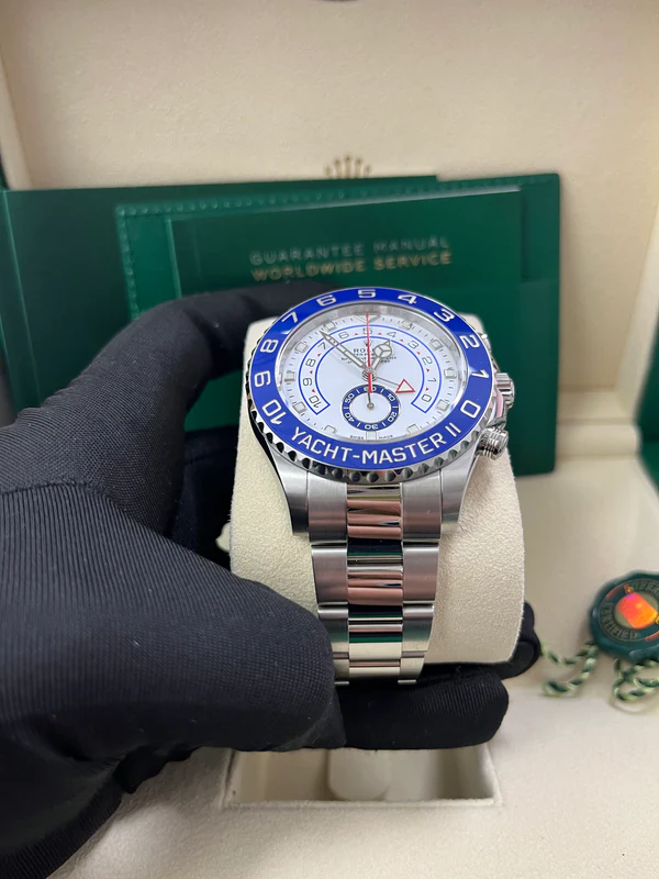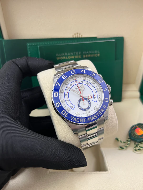 The Yacht-Master II is equipped with a new dial, and new hands that are characteristic of Rolex Professional models, enhancing legibility and sharpening its aesthetic appeal. The dial now features a triangular hour marker at 12 o'clock and a rectangular hour marker at 6 o'clock for more intuitive reading of the watch. A luminescent disc on the hour hand clearly distinguishes it from the minute hand. The Yacht-Master II's countdown can be programmed for a duration of between 1 and 10 minutes. The programming is memorized by the mechanism so that at a reset it returns to the previous setting. Once launched, the countdown can be synchronized on the fly to match the official race countdown.